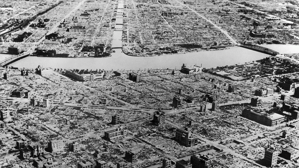 At just after midnight on March10 the pathfinders laid a huge, flaming X across that section of Tokyo where all those subcontractor workshops were located, making the parts for new aircraft. The main force followed and dropped 1,665 tons of incendiaries.