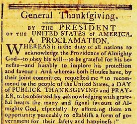Washington wrote October 3, 1789: “Whereas it is the duty of all Nations to acknowledge the providence of Almighty God, to obey his will, to be grateful for his benefits, and humbly to implore his protection and favor and Whereas both Houses of Congress have by their joint Committee requested me to recommend to the People of the United States a Day of Public Thanksgiving and Prayer to be observed by acknowledging with grateful hearts the many signal favors of Almighty God, especially by affording them an opportunity peaceably to establish a form of government for their safety and happiness now, therefore, I do recommend Thursday, the 26TH DAY of NOVEMBER to be devoted by the People of these United States to the service of that great and glorious Being, who is the beneficent Author of all the good that was, that is, or that will be, that we may then all unite in rendering unto Him our sincere and humble Thanks for the peaceable and rational manner in which we have been enabled to establish constitutions of government particularly the national one now lately instituted, for the civil and religious liberty with which we are blessed to promote the knowledge and practice of true religion and virtue.”