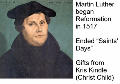 Luther considered “saints days” a distraction from Christ, so he effectively ended them in Protestant countries, including the popular December 6th “St. Nicholas Day.” Since Germans like the gift-giving, Martin Luther moved the giving to December 25th to emphasize that all gifts come from the Christ Child.