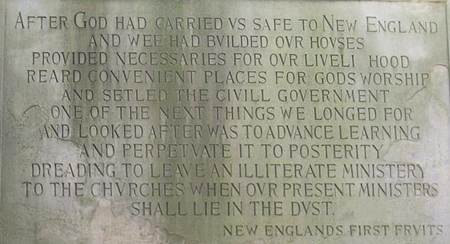 “After God had carried us safe to New England, and we had builded our houses, provided necessaries for our livelihood, rear’d convenient places for God’s worship, and settled the Civil Government: One of the next things we longed for, and looked after was to advance Learning and to perpetuate it to Posterity; dreading to leave an illiterate Ministry to the Churches, when our present Ministers shall lie in the Dust. And as we were thinking and consulting how to effect this great work, it pleased God to stir up the heart of one Mr. Harvard, a godly gentleman and a lover of learning there living amongst us, to give the one half of his estate towards the erecting of a college and all his Library.”
